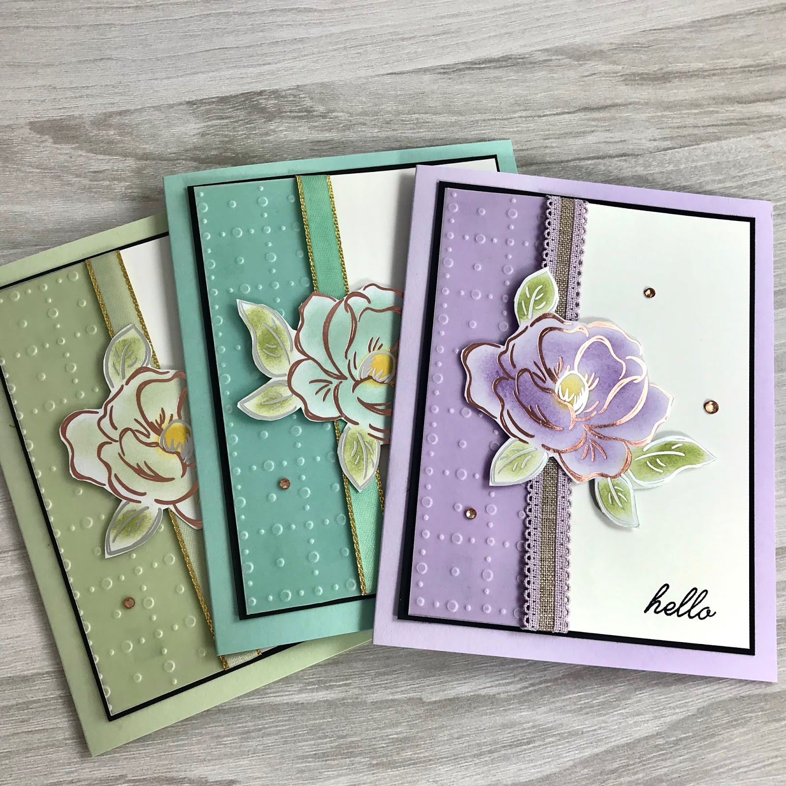 If you would like to create these lovely cards and need the supplies to make them please go to my on-line store here to purchase. In order to get the Flowering Foils or the So Very Vellum you must have a qualifying order.
