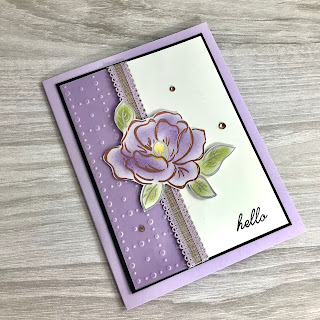 This card uses Purple Posy and Highland Heather ink since we have no Purple Posy ink. I used sponge daubers to color the flowers which were fussy cut from the Flowering Foils DSP. I backed each piece of the So Very Vellum with its corresponding card stock.