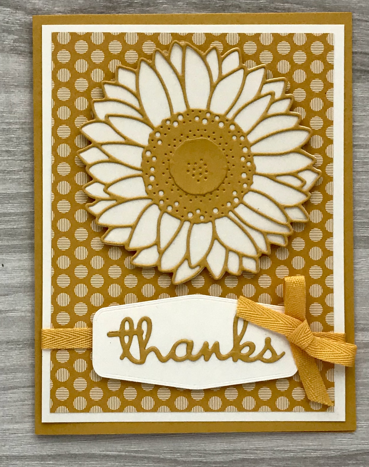 Who doesn’t like sunflowers? They make me happy just looking at them. This a new stamp set and dies in the Annual Catalog. It is a very versatile set with many options for cards. It goes great with the new in-color designer paper and also the Flowers for Every Season DSP. I used it in class this week with the in colors to create 4 different cards. Here it is in the Bumblebee color.