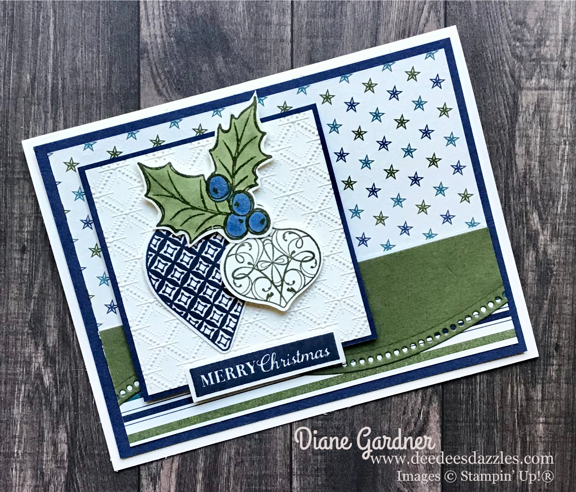 I used a thick very vanilla cardbase. The next layer is NIght of Navy cut to 5 1/4″ x 4″. Next layer is Brightly Gleaming DSP cut to 5″ x 3 3/4″. The DSP on the bottom is cut to 5″ x 1 1/2″. I used the Curvy Celebrations dies to cut a piece of Mossy Meadow. I did not measure this just die cut it and cut off the other end. I attached this over the seam of the two DSP’s. I cut a piece of Night of Navy 3″ x 3″ and a piece of Very Vanilla to 2 3/4″ x 2 3/4″ and ran this piece thru the Stampin’ Cut & Emboss Machine with the Dainty Diamonds embossing folder. I stamped the two ornaments from the Christmas Gleaming stamp set in Night of Navy and Mossy Meadow and punched them out with the two punches. The holly is stamped with Mossy Meadow and colored with blends. I used Wink of Stella on the holly piece. I fussy cut the holly.