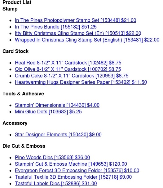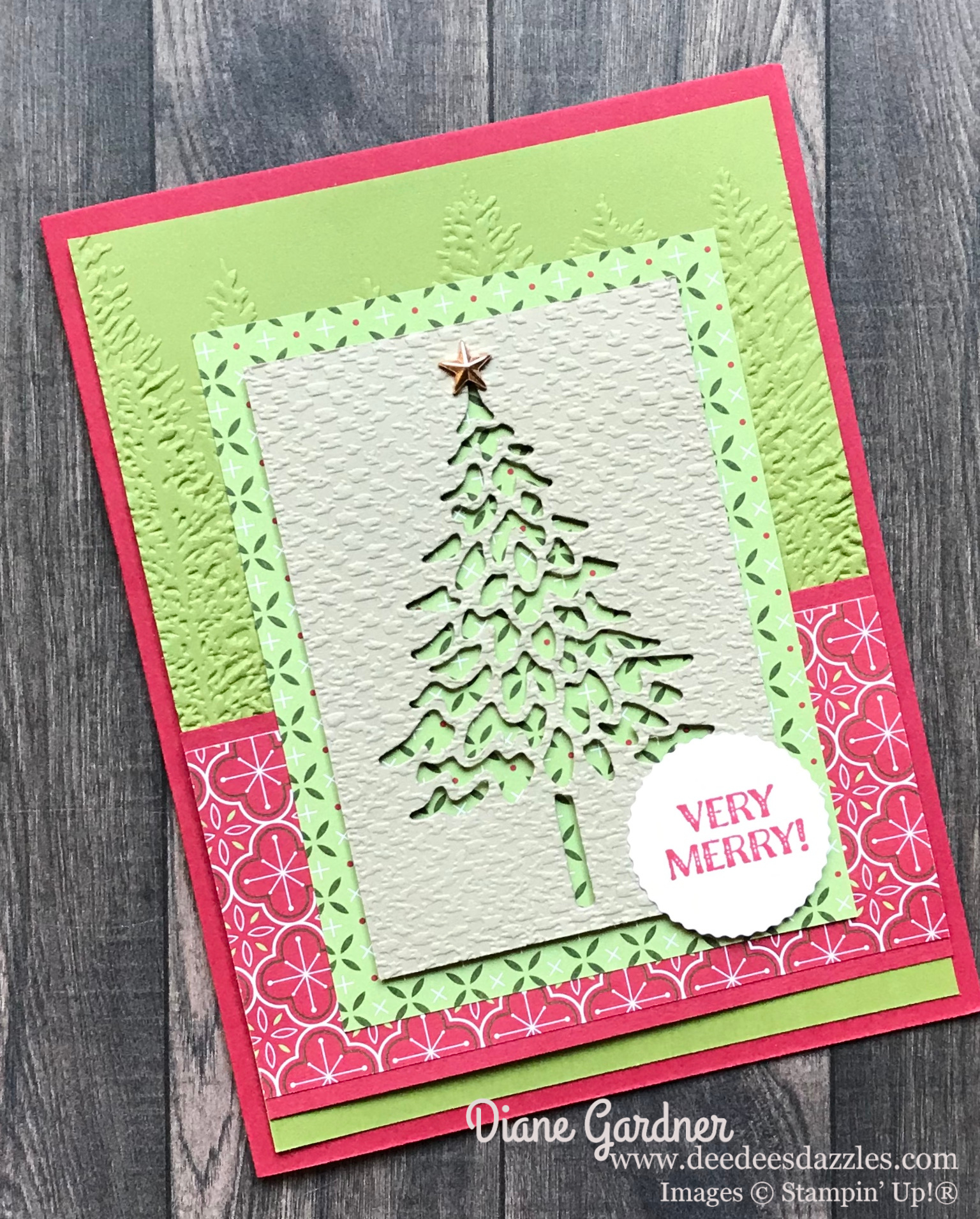 The first card uses the Pine Woods dies from the In The Pines Bundle. The Very Merry comes from the stamp set Itty Bitty Christmas. The DSP is from the Heartwarming Hugs. We used the Evergreen Forest embossing folder and the Tasteful Textile embossing folder.