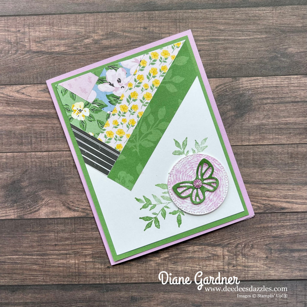 I used the Textured Notes Bundle to create my card with the Lovely Garden Designer Series Paper from the March On-Line Exclusives. Most of the catalog and Pinterest samples are made with the Woven Textures DSP. Herringbone is the technique that was used to create this card during my April Card Classes. We used strips of DSP cut 3/4″ wide and glued them to the Basic White. The class attendees could use whatever patterns they liked best, so the cards all looked different. My colors came from the DSP – Free Freesia, and Garden Green. Come back tomorrow for some more samples.