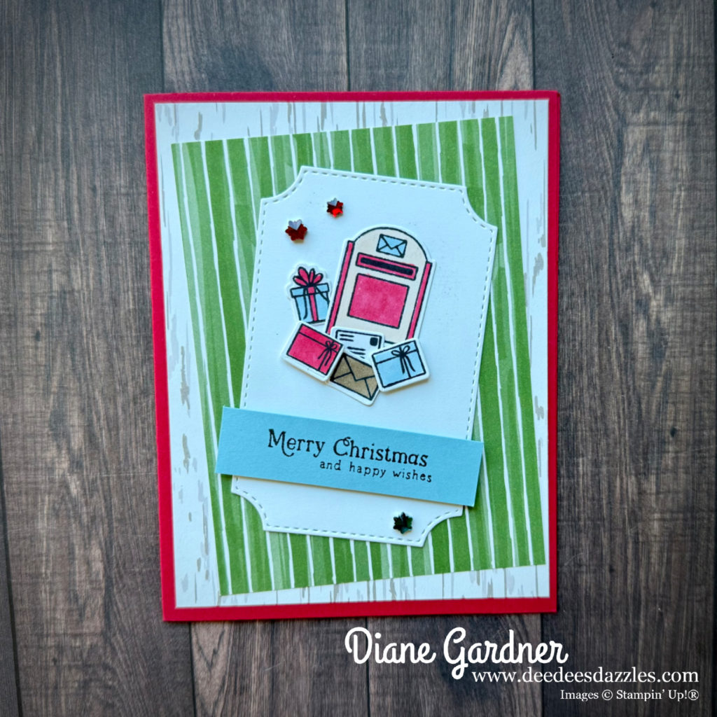 I belong to a group of stampers that participate in the Build & Bloom blog hop every month. This month’s theme is festive, so I chose the Jolly Delivery stamp set to create a festive Christmas card. I bought this stamp set for the cute little box that you can make from the dies. Have I made a box yet??? No! But maybe soon!