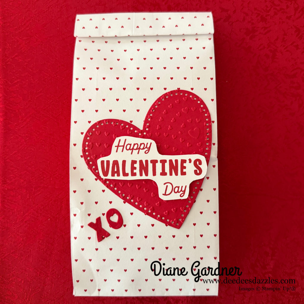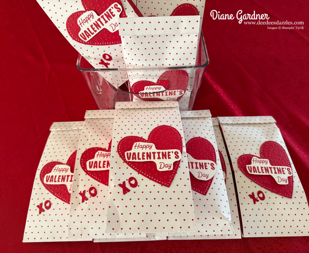 How do you get one of these for free? Attend one of my in-person classes next week and you will be gifted one of the goody bags. I used the Hearts Gusseted Treat Bags and the Endless Love Bundle to complete my bags. You can use the bags for Valentine’s Day or change the color with a blending brush for other occasions.